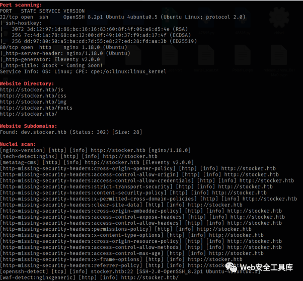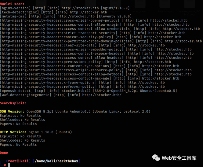 4、只需要输入域名,即可获取开放端口和服务版本、web目录、子域名、插件漏洞信息,还可以根据扫描到的服务版本自动在Kali的exploit-db漏洞库中搜索相关漏洞