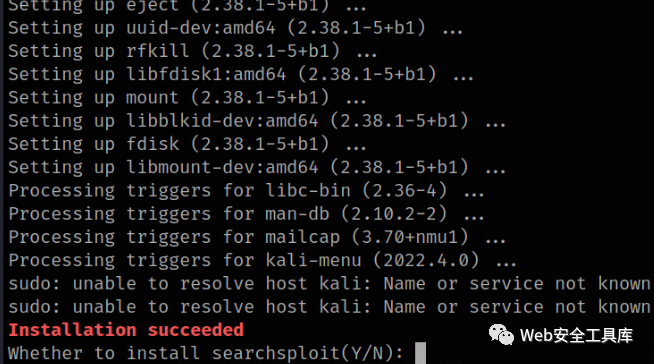 需要等待几分钟,期间需要手动选择一些东西,默认即可,安装完成后会提示是否安装searchsploit。这个工具很大,所以在这里问。如果网络好,可以安装。