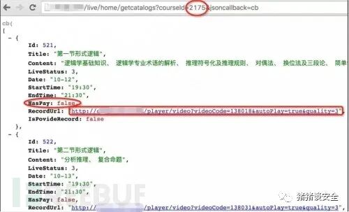 b). 发现是否付费只靠前端js控制,更改courseID就可以看到不同的课程,recordURL就是视频播放的链接,无需登录即可播放。
