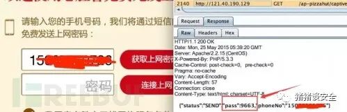 某免费wifi连接时需要使用发送到手机的密码进行验证,抓取发送密码的数据包时,发现密码返回客户端,导致任意全网账号可以登录联网。