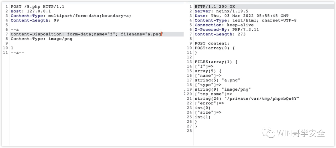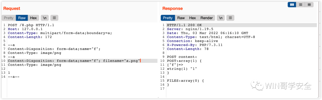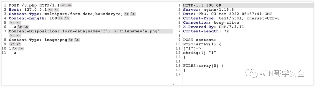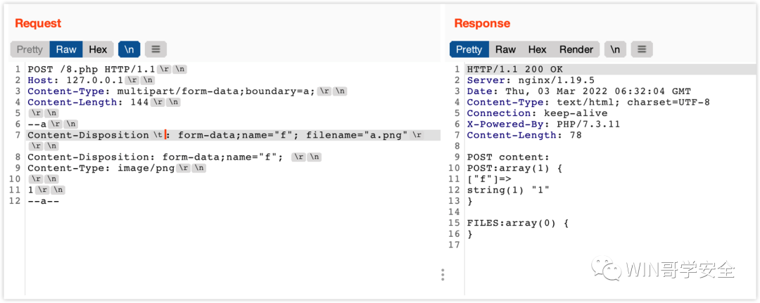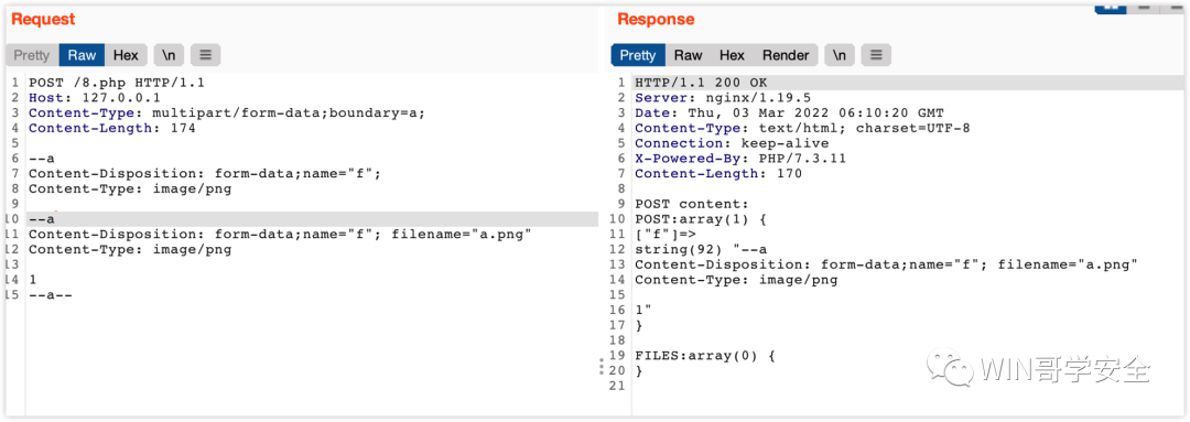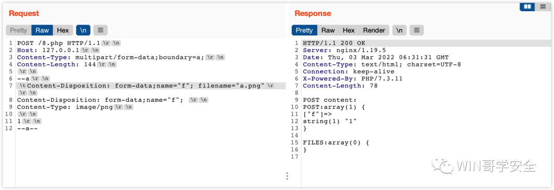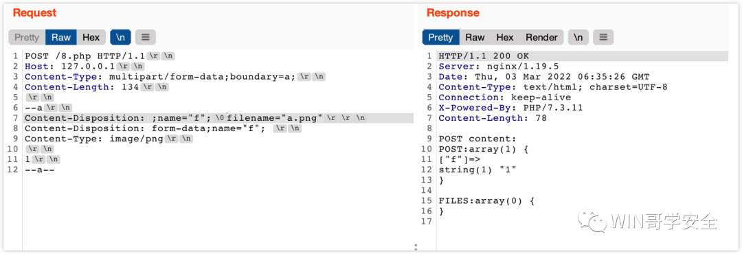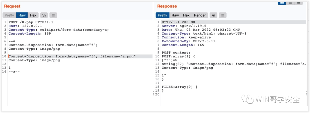 可以看到,实际上和前一种urlencoded是达到了同一种效果,参数并没有进入$_FILES数组,而是进入了$_POST数组。那么,何时是上传文件?何时是POST参数呢?这个关键点在于有没有一个完整的filename=。这9个字符是经过反复测试的,缺一个字符不可,替换一个字符也不可,在其中添加一个字符更不可。