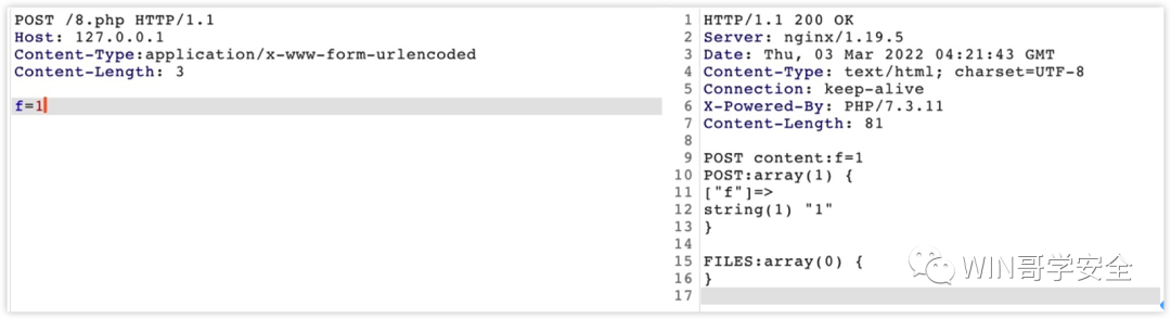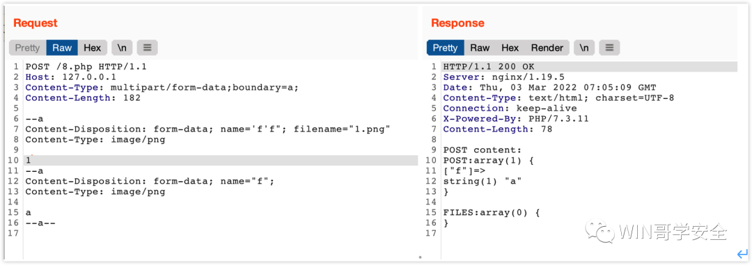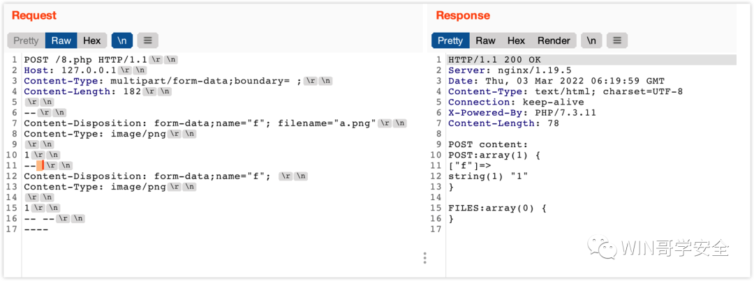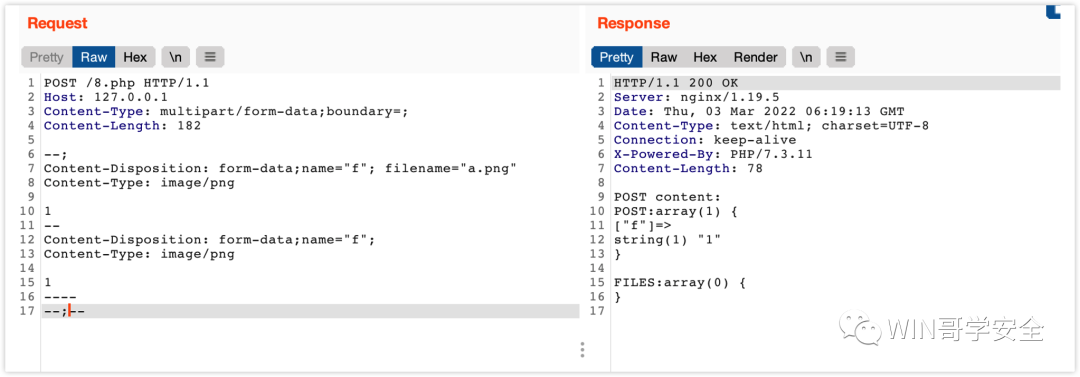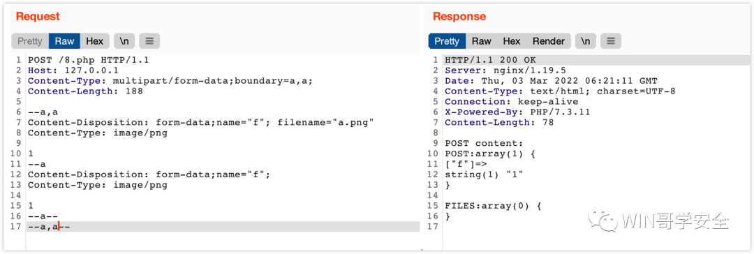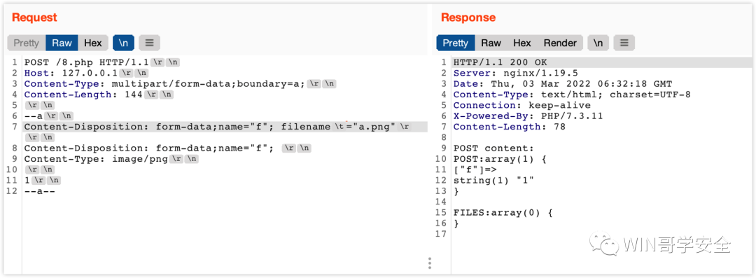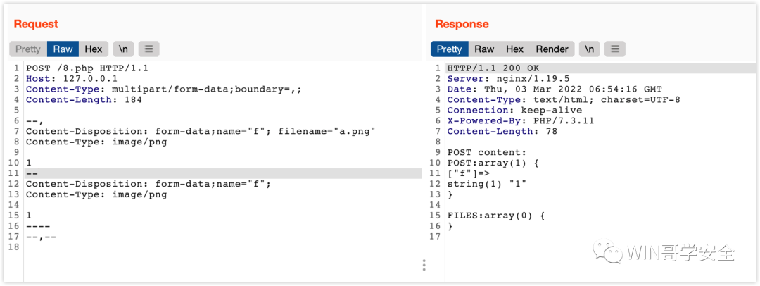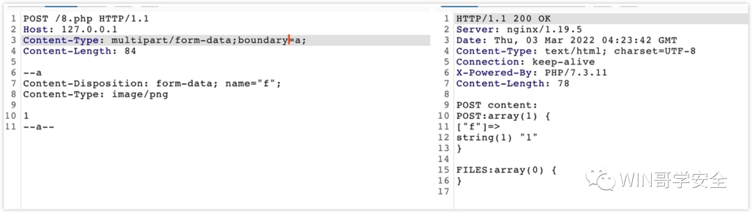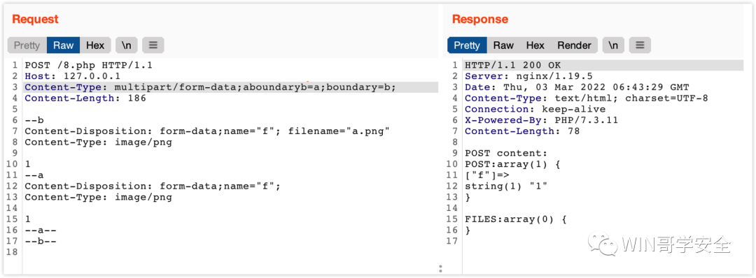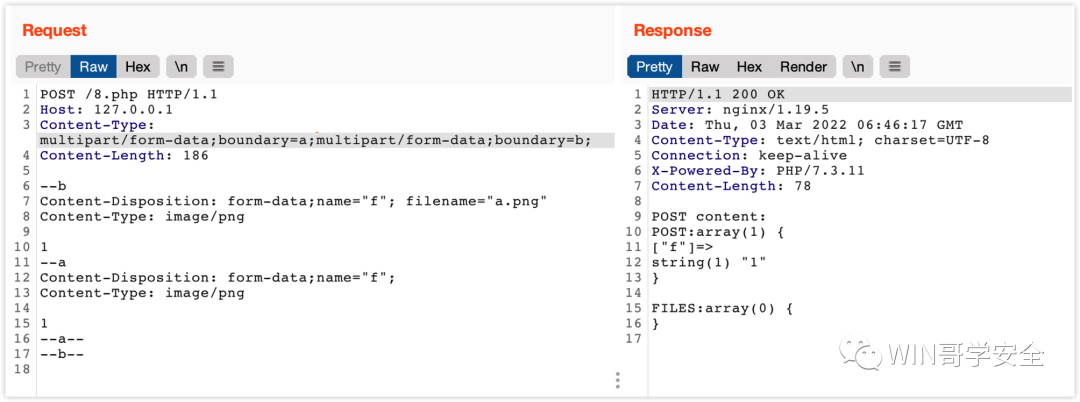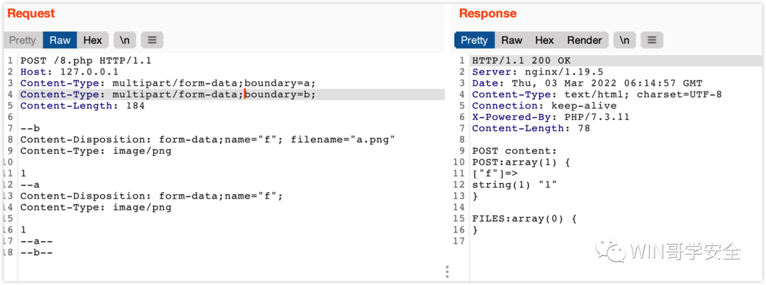 我们知道,HTTP协议POST请求,除了常规的application/x-www-form-urlencoded以外,还有multipart/form-data这种形式,主要是为了解决上传文件场景下文件内容较大且内置字符不可控的问题。multipart/form-data格式也是可以传递POST参数的。对于Nginx+PHP的架构,Nginx实际上是不负责解析multipart/form-data的body部分的,而是交由PHP来解析,因此WAF所获取的内容就很有可能与后端的PHP发生不一致。