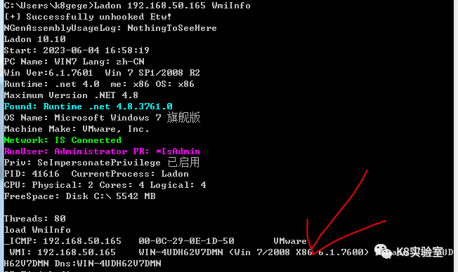 目标系统位数不指定DLL时,默认Ksmb自动识别,指定DLL可使用WmiInfo来确认,如下图目标32位系统。