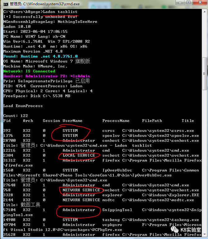 对相关进程不熟悉的,可使用Ladon的Tasklist命令获取当前系统详细进程信息,有进程对应完整路径、PID、位数、用户权限、标题等信息。实战也可以用来查找一些C2,比如进程为svchost.exe,但是程序路径非system目录,连检测都不用检测就知道这程序肯定有问题。当然也可以用来查找管理员当前正在操作的一些工具,安装路径在哪,而不是盲目的乱翻。