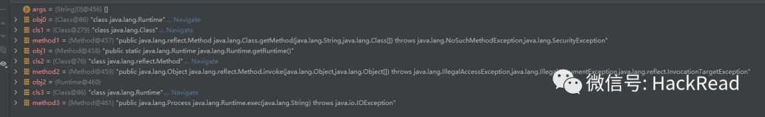 在第二个InvokerTransformer会调用getRuntime这个Method的invoke方法,这样返回了一个Runtime对象