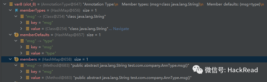 第一个memberTypes存放的是名字到Class的对应关系,第二个memberDefaults存放的是名字到默认值的对应关系,第三个members存放的是名字到方法的对应关系。以我们例子的AnnType注解为例,成员如下: