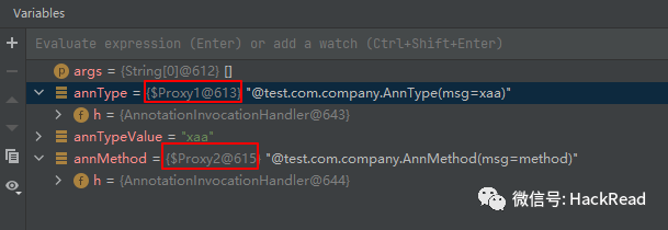 annotationForMap创建了动态代理,这里的var0参数是AnnType的Class对象,var1是一个LinkedHashMap,里面保存了各个注解名称与值。比如Person类的注解内容”msg”->”xaa”。handler为AnnotationInvocationHandler。