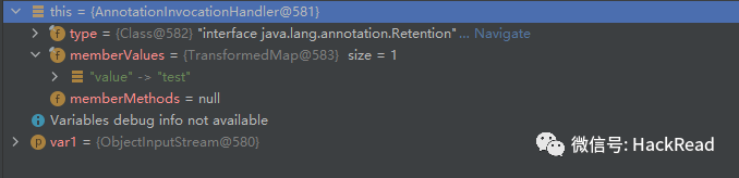 var1.defaultReadObject首先调用默认的反序列化函数,这样就将AnnotationInvocationHandler准备好了。