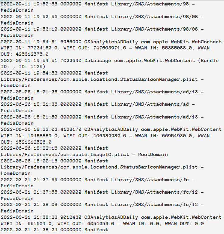 研究人员创建的移动设备备份包含文件系统的部分副本,包括一些用户数据和服务数据库。文件、文件夹和数据库记录的时间戳允许研究人员重建设备上发生的事件。mvt-ios实用程序将事件的排序时间轴生成一个名为“timeline.csv”的文件,类似于传统数字取证工具使用的超级时间轴。