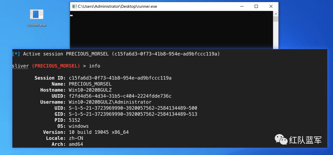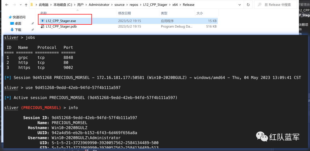 之后就是使用c语言编写简易分阶段执行器Stager(shellcode runner),运行上面的shellcode,建立连接,后Sliver分阶段传输Sliver Shellcode至目标机器上运行,成功上线。