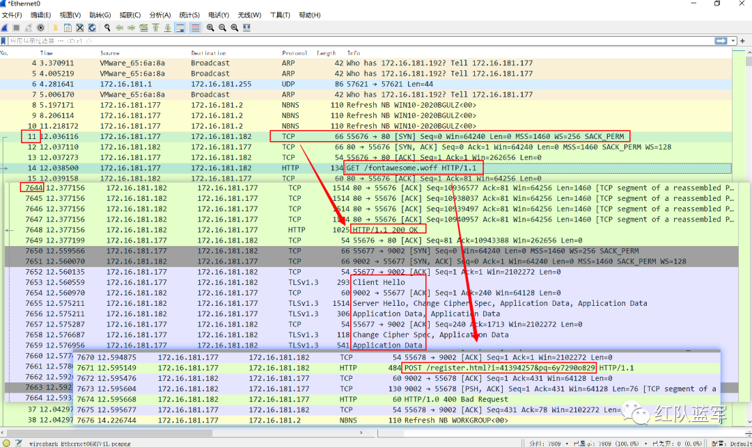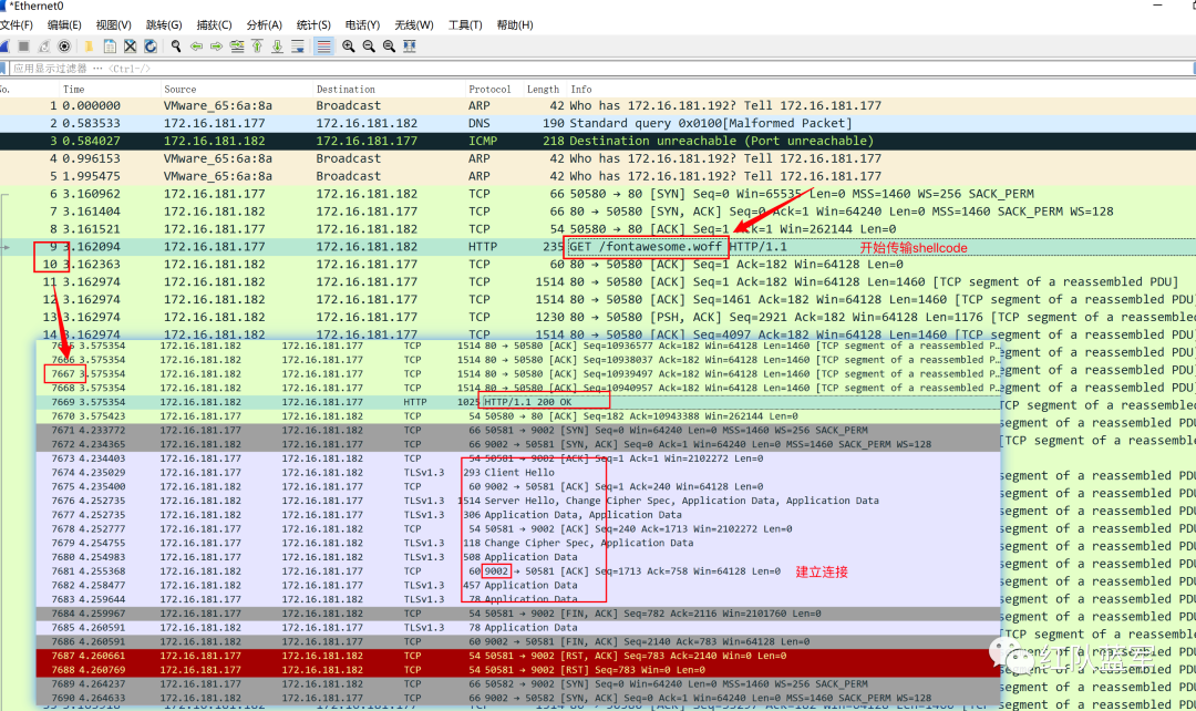 首先是发送带有.woff的 url,请求下载shellcode,接着通过7000+个TCP请求后,成功下载完成,后续建立TLS连接。