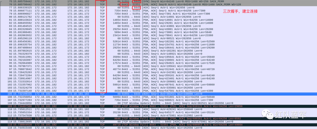 在C2服务器上抓包,首先是stager在TCP 8443 中建立连接,传输Sliver shellcode至目标主机上。
