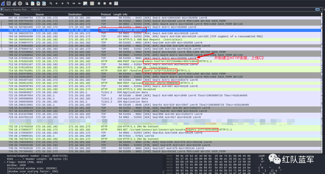 和上面类似,首先是发送带有 .woff 的 url,请求下载shellcode,接着通过7000+个TCP请求后,成功下载完成,后续建立TLS连接,发送带有.html后缀的url,表示Sliver启动会话,建立C2连接。