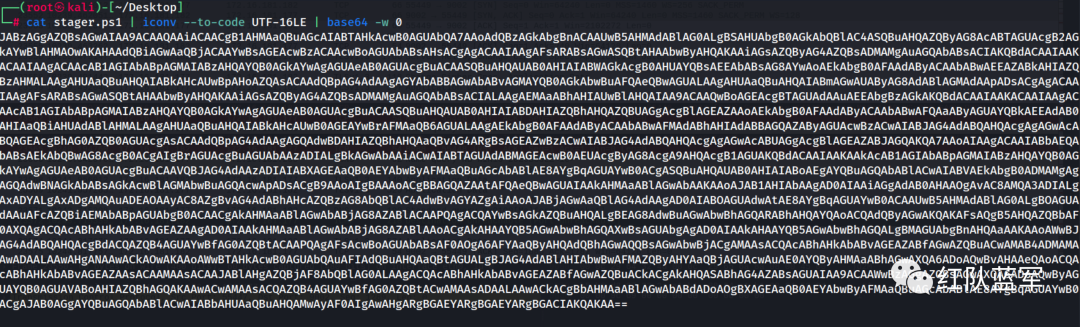 cat stager.ps1 | iconv --to-code UTF-16LE | base64 -w 0