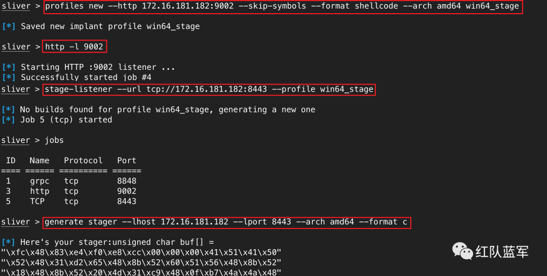 在有了配置文件之后,就可以创建一个分阶段监听器,可通过 TCP 或 HTTP(S) 协议来传输 Sliver ShellCode 至目标主机上。