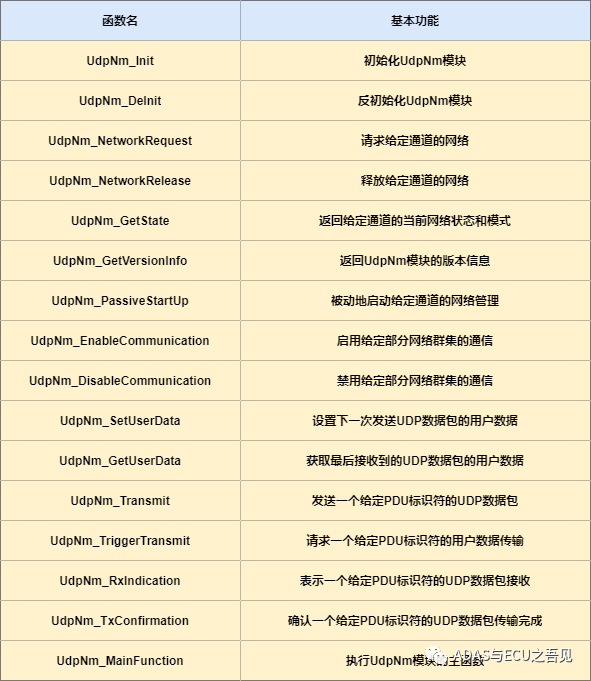 图10 UdpNm NM报文接收时序 常用函数接口说明 为了便于大家在软件开发过程中的调试,小T将UdpNm模块较为重要的一些函数列举如下,供大家参考,如下图11所示: