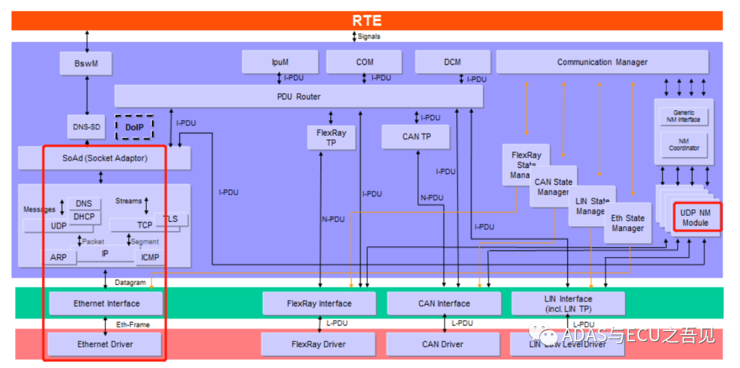 基于TCP/IP的车载以太网系统 :UdpNm可以与TCP/IP协议栈一起工作,实现车载以太网节点的协同睡眠和唤醒,提高网络效率和节省能源。