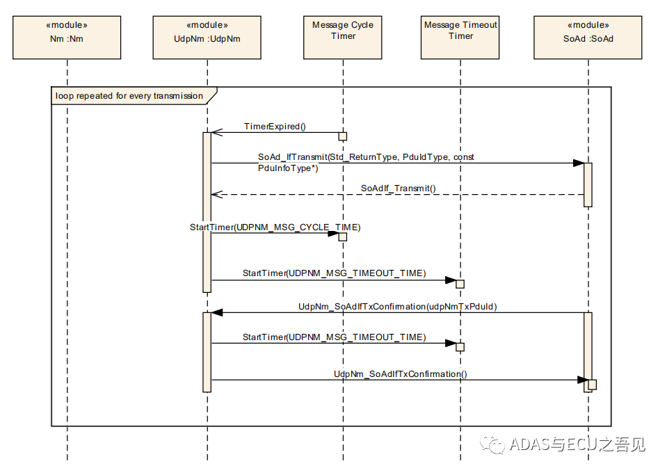 从下图8可以看出,每次Message Cycle Timer超时之后便会触发依次UdpNm的一次NM报文发送,发送接口通过调用SoAd_IfTransmit 来实现,同时也会重置Message Cycle Timer计数器与UDPNM_MSG_TIMEOUT_Timer计数器 。