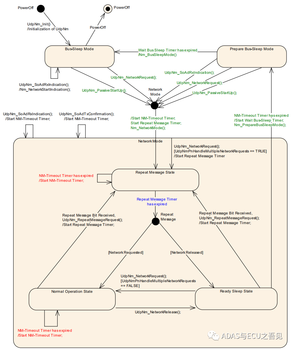 网络管理算法 :定义了UdpNm如何根据接收和/或传输的UDP数据包来切换不同的网络状态,并执行相应的动作,定义了UdpNm如何根据不同的网络状态和条件来确定何时发送或接收UDP数据包,并说明了发送或接收UDP数据包所遵循的规则和流程。。