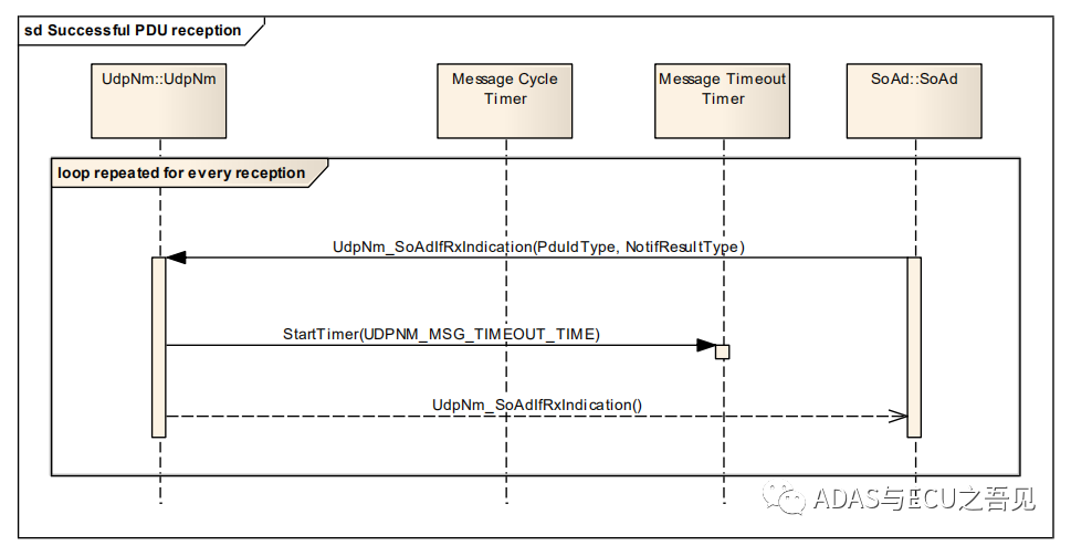当确认UdpNm成功外发之后,SoAd模块便会通过回调函数接口UdpNm_SoAdIfTxConfirmation 来通知UdpNm模块,此时UdpNm模块便会重置UDPNM_MSG_TIMEOUT_Timer计数器 。