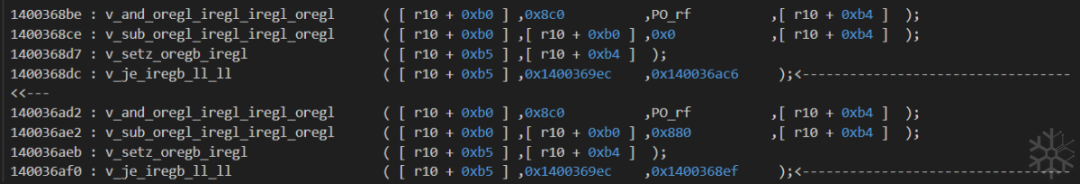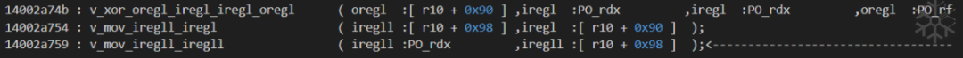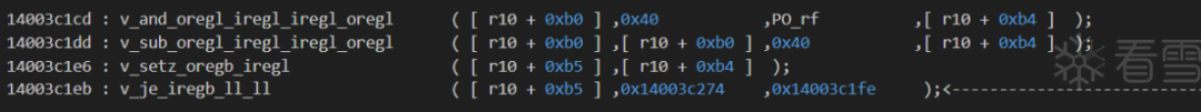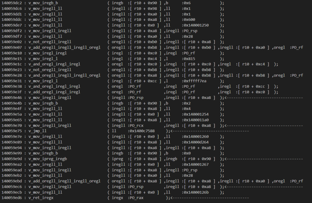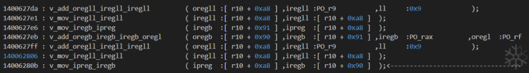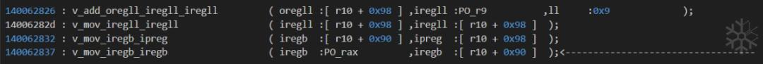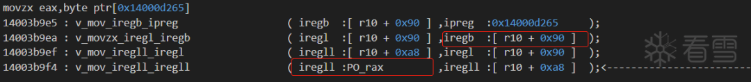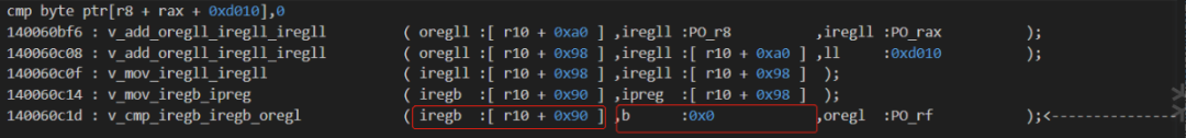 140062837这一条workingTraceCode:v_mov_iregb_iregb ( iregb :PO_rax ,iregb :[ r10 + 0x90 ] );看到第二个参数的类型为 iregb,是8bit宽的操作数。