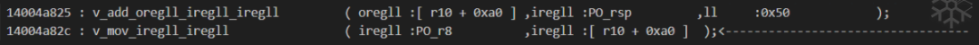 14004a82c这一条workingTraceCode:v_mov_iregll_iregll ( iregll :PO_r8 ,iregll :[ r10 + 0xa0 ] );GetAsmPara( PO_r8 ) 返回 "r8" GetAsmPara( [r10 + 0xa0 ]) :