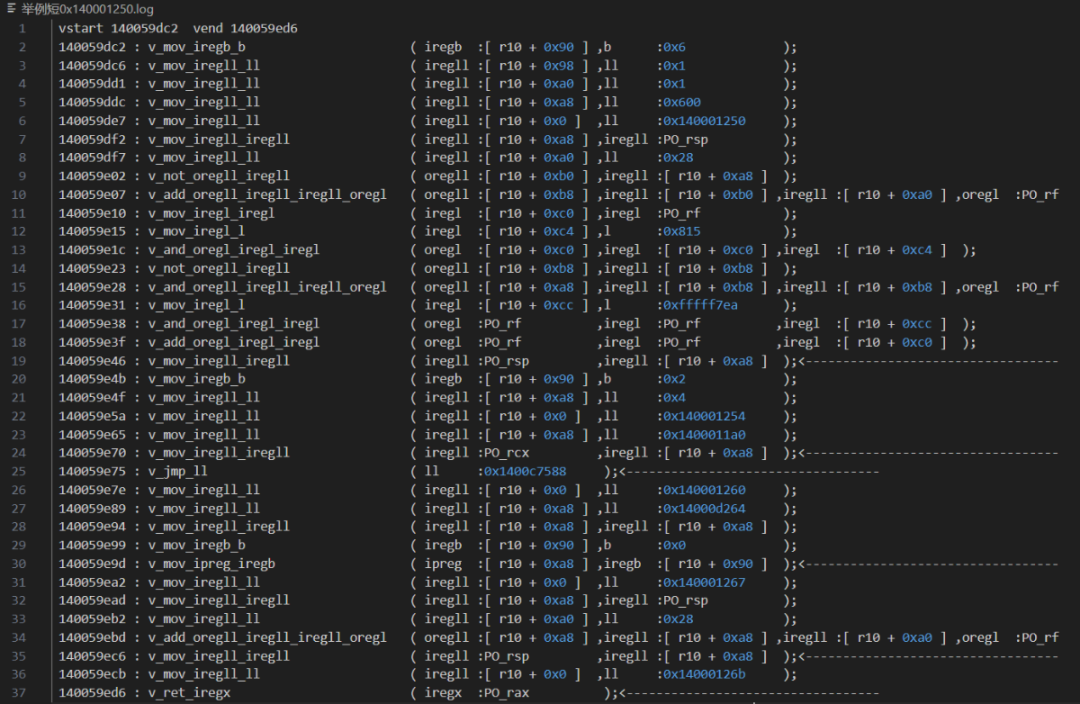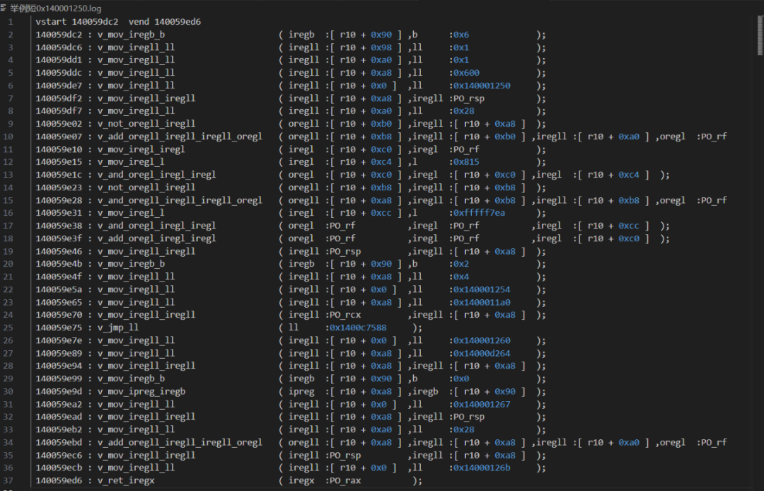 main0是对全部ida识别的函数进行特征分析,如果符合tvm函数特征,就对它进行还原。0x140001250它是被vm的,那么你这么写,脚本就会自动特征识别V_RIP。testTrace = traceTask(0x140001250,tvm0base) #tvm0base是tvm0段的起始地址