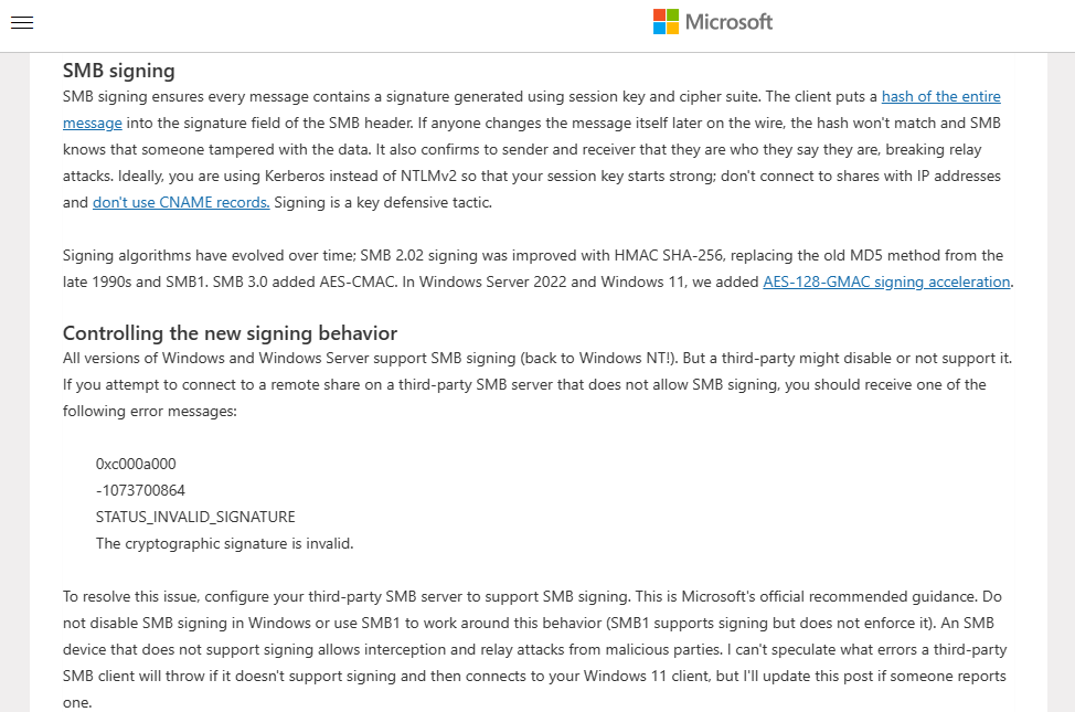 SMB签名可以确保每条消息都包含使用会话密钥和密码套件生成的签名。如果有人在传输过程中更改了消息本身,则整个消息的哈希值将不匹配,从而可得知有人篡改了数据。它还会确认发送方和接收方是否是本人,以此防范中继攻击。微软官网上说,所有版本的Windows和Windows Server都支持SMB签名,但第三方可能会对它禁用或不支持。如果用户尝试连接到不允许SMB签名的第三方SMB服务器上的远程共享,用户应该会收到以下错误消息之一:0xc000a000、-1073700864、STATUS_INVALID_SIGNATURE、The cryptographic signature is invalid.若要解决此问题,可以将第三方SMB服务器配置为支持SMB签名。微软不建议在Windows中禁用SMB签名或使用SMB1来解决此问题(SMB1支持签名但不强制执行)。不支持签名的SMB设备允许恶意方进行拦截和中继攻击。同时,SMB签名不可避免会略微降低SMB复制操作的性能,用户需要谨慎对自身实际情况进行评估,以判断极高性能和延迟要求是否优先于未签名流量带来的安全性缺失。若要查看当前SMB签名设置,请运行以下PowerShell命令::Get-SmbServerConfiguration | FL requiresecuritysignatureGet-SmbClientConfiguration | FL requiresecuritysignature若要禁用客户端连接中的SMB签名要求,请以管理员身份运行以下PowerShell命令:Set-SmbClientConfiguration -RequireSecuritySignature $false若要禁用服务器中的SMB签名要求,请以管理员身份运行以下PowerShell命令:Set-SmbServerConfiguration -RequireSecuritySignature $false微软表示,在未来几年,他们将继续推出更安全的SMB默认设置和许多新的SMB安全选项;微软知道这些变化会影响应用程序兼容性,并且Windows也有确保易用性的传统,但安全性不能听天由命。指已经发布官方补丁的漏洞。通常情况下,此类漏洞的防护只需更新补丁即可,但由于多种原因,导致往往存在大量设备漏洞补丁更新不及时,且漏洞利用方式已经在互联网公开,往往此类漏洞是黑客最常使用的漏洞。例如在永恒之蓝事件中,微软事先已经发布补丁,但仍有大量用户中招。
