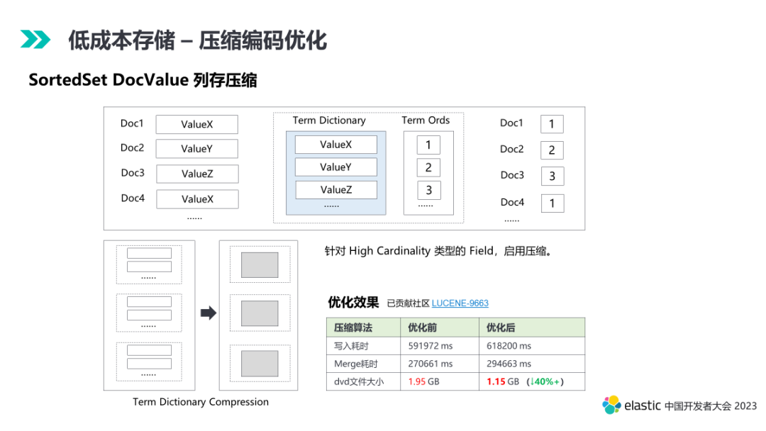Lucene 列存存储分为两部分,term dictionary 和 term ords,每个字段值的原始内容存储在 term dictionary 中,实际编码、计算的时候为了避免冗余而采用 term ords,后者会随着新数据的持续写入而动态更新。优化的主要内容是对 term dictionary 中的原始字段字面内容进行压缩存储。从优化后的压缩效果对比来看,写入、merge 耗时基本不变的情况下,列存存储下降了 40%+。