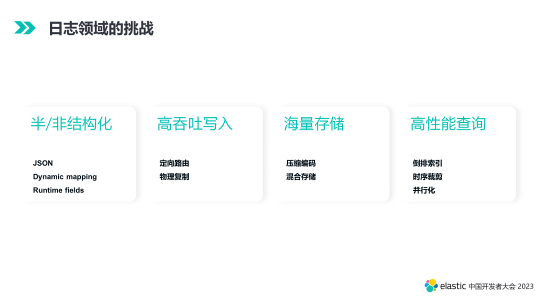 下面是日志领域的挑战总结,后面将针对高吞吐写入、低成本存储、高性能查询层面的优化进行详细分析。