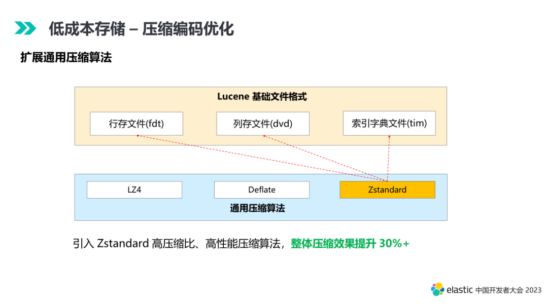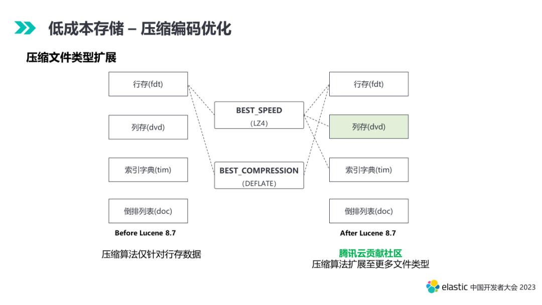 压缩编码优化是在原始数据结构不变的前提下,降低单位文档存储成本非常有效的方式。上图中描述了 ES 底层 Lucene 的存储格式,以及这些格式所用到的压缩算法。其中列存压缩是由腾讯贡献给社区的。