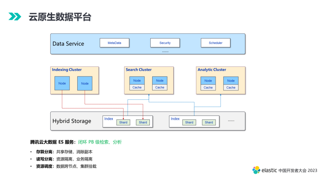 下一阶段,腾讯云 ES 将打造云原生数据平台,闭环 PB 级数据检索、分析场景,全面覆盖日志场景低成本、高性能的需求。底层基于共享存储,消除冗余副本,实现存算分离架构,中间计算层会提供多种维度的集群,实现读写分离,检索、分析场景分离等。上层提供各种免运维的数据服务,实现资源灵活调度,数据跨节点、跨逻辑集群挂载等。