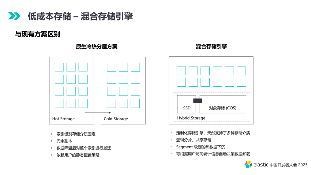 日志场景传统的降本方案一般采用冷热分层。混合存储引擎与冷热分层主要的区别包括:
