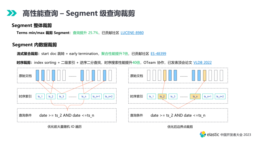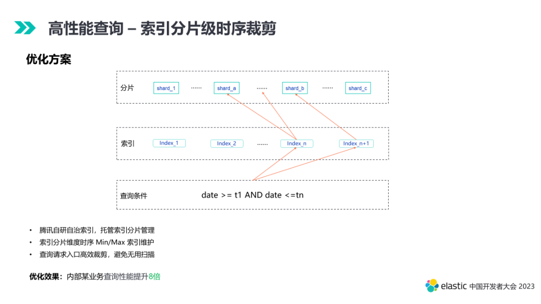 在日志场景,索引一般是按照一定的时间周期进行滚动,腾讯自研了自治索引,帮助用户托管索引分片的管理,用户无需关心底层分片的数量、大小、分布配置。简化数据接入门槛。在此基础上,我们维护了索引级别的 Min/Max,当查询请求进来的时候,可以针对用户的查询区间进行精准的物理索引过滤裁剪,大幅降低无用索引的空转扫描过程。通过索引分片维度的时序裁剪,大幅提升查询性能,内部视频日志业务实测查询性能提升 8 倍。