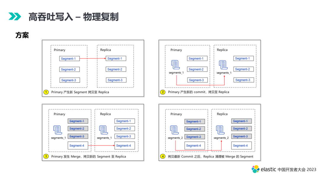 如上图方案所示,第一步当 Primary 产生新的 Segment 之后,会及时通过物理拷贝方式同步至 Replica,使得 Segment 在 Replica 上可见,同时消除 Replica 上内存构建 Segment 过程的计算开销。当 Primary 上产生新的 Commit 文件之后,也会及时同步至 Replica。同步 Commit 文件的目的主要是在 Replica 侧清理过期的 Translog 和被合并的 Segment。例如在上面第三、四步中就描述了 Primary 侧 Segment 合并之后同步到 Replica 侧清理的过程。