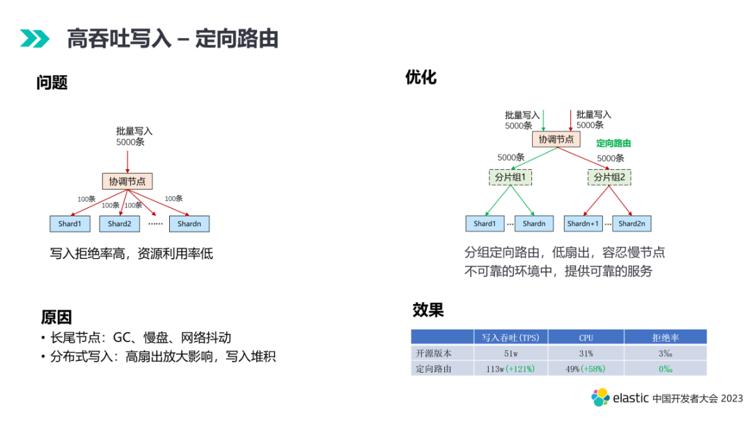 ES 的一个 Bulk 写入先进到协调节点(任意一个数据节点),会被拆分为若干个分片粒度的子写入请求,并分发给对应的数据节点。当集群规模较大,索引的分片数较多的场景下,分布式写入的扇出放大非常严重,很容易受到个别长尾节点的 GC、慢盘、网络抖动等影响,导致写入堆积,资源利用率低,拒绝率高。