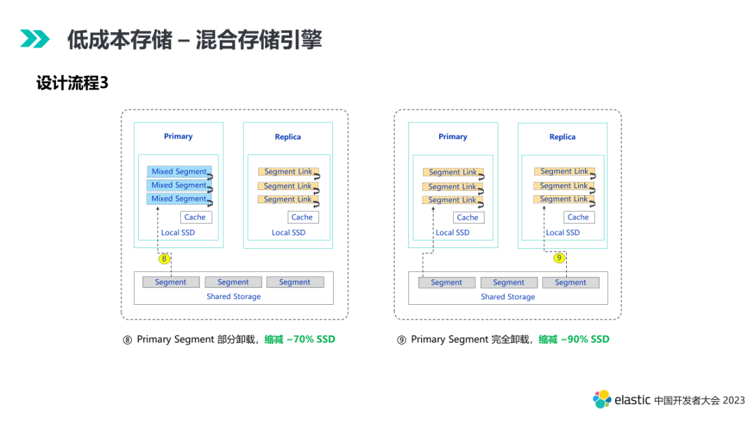 第八个阶段,查询频率大幅缩减。Primary 上只有部分数据或部分 segment 需要被查询,此时 primary 上的部分文件或 segment 会先被卸载。同时本地构建缓存体系加速查询。本阶段 SSD 的缩减达到 70% 左右,但仍然能满足业务的查询需求。
