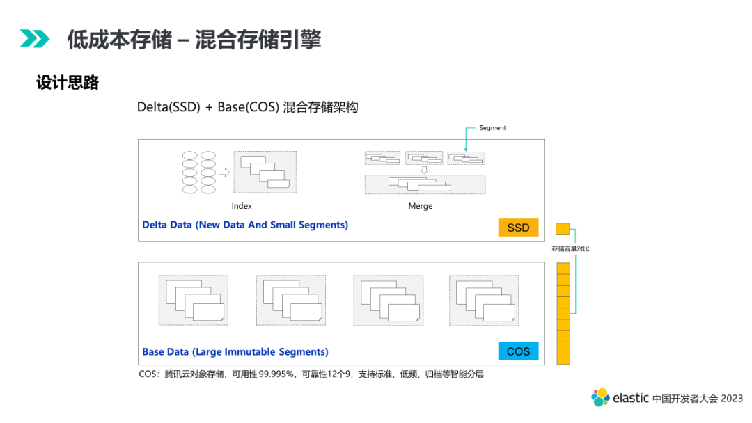 混合存储引擎的整体设计思路是基于典型的 delta + base 架构。其中 delta 部分我们采用 SSD,主要目的为了扛高并发写入,以及小 segment 的存储及合并;而 base 部分采用对象存储,用于存储大量不可变的大 segment,一方面其高可用(4 个 9 一个 5)、高可靠(12 个 9)、按量付费、免运维的架构降低了大量运维成本,更重要的是其提供的标准、低频、归档等灵活的低成本存储方案能大幅降低海量日志的存储成本。