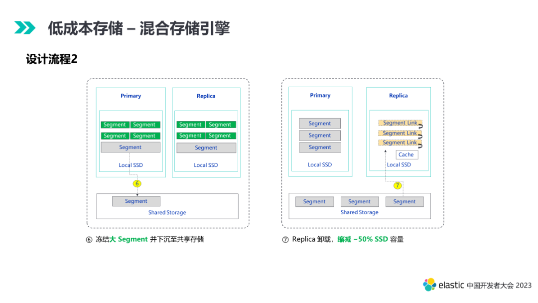 第六个阶段,本地 segment 通过 merge 产生了较大的 segment,会被冻结不再参与 merge,并下沉至底层共享存储。注意这个阶段是从热数据就开始的,并不是数据降温后才启动下沉,可以避免数据降温后整体下沉的排队拥塞,当然可以根据用户的需求进行灵活配置。此时,日志场景大量的查询会集中在本地,本地 primary 和 replica 也能很好的抗住读写压力。
