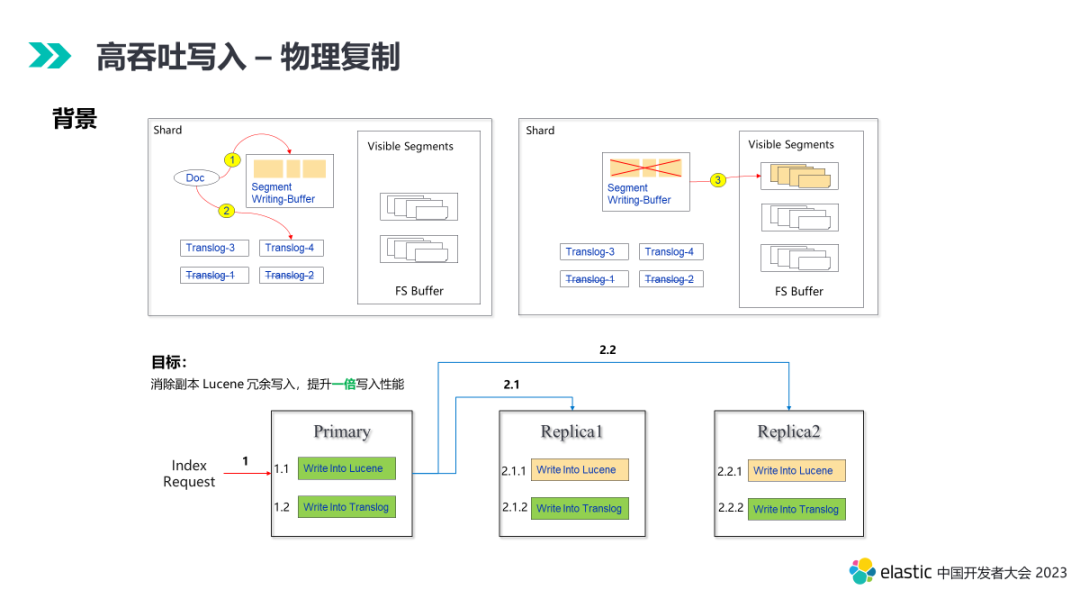ES 分布式层的写入,数据先从协调节点转发至 Primary,主分片写完 Lucene 和 Translog 之后并行转发给多个 Replica,副本分片完成 Lucene 和 Translog 的写入。这个过程中,副本分片的 Lucene 写入是冗余的,因为这个写入栈在 Primary 上进行了一遍,在 Replica 上会完整的再来一遍,开销非常高。