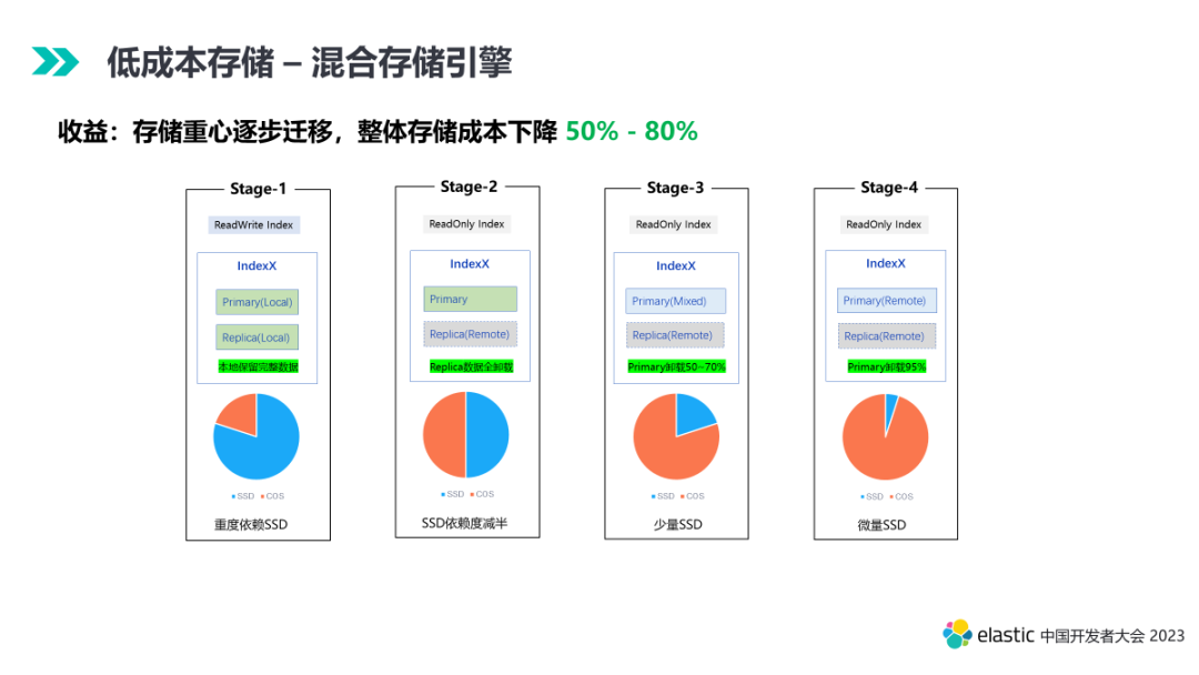 上面是完整的索引生命周期中数据的演变过程,存储重心随着数据逐渐降温过程逐步从 SSD 到对象存储迁移,且用户无明显感知,最终整体存储成本下降 50% - 80%。