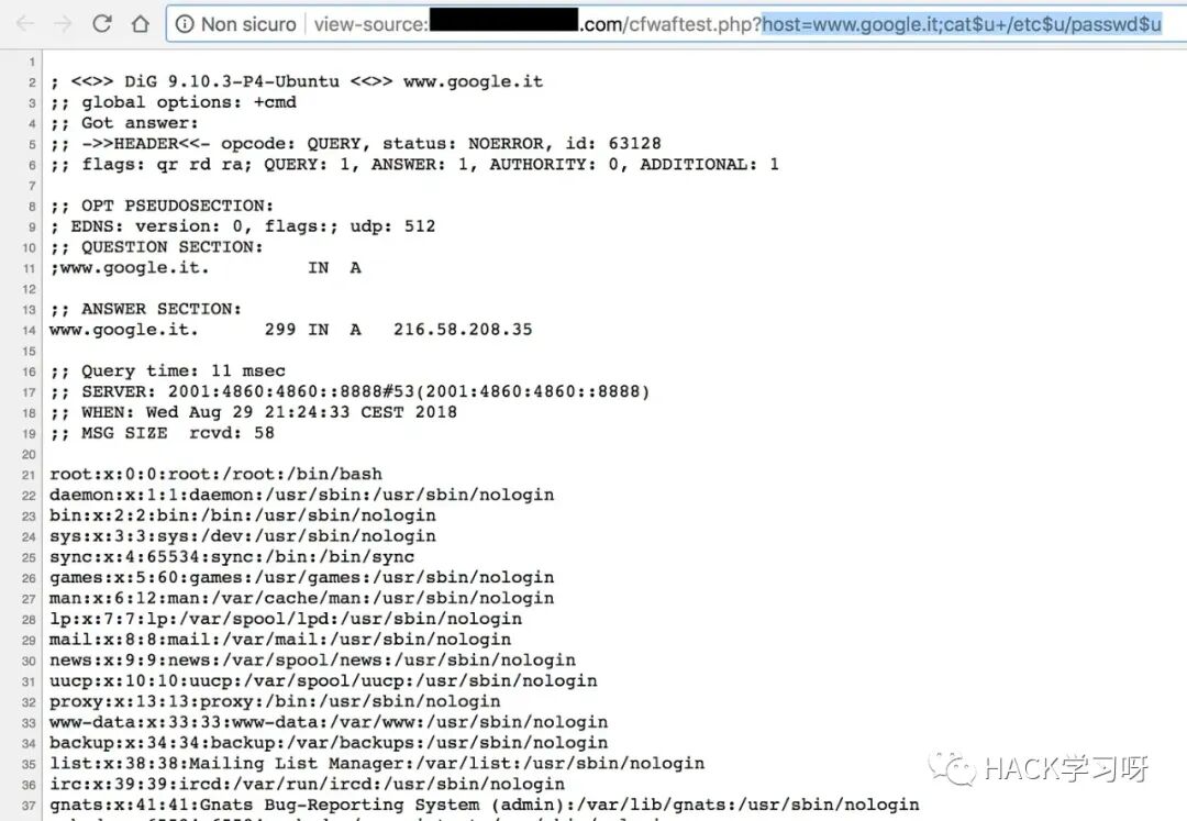如前所述,WAF通常会阻止公开的恶意流量。为了触发防火墙并验证其存在,可以向网络应用程序发出HTTP请求,在URL中加入恶意查询,如https://example.com/?p4yl04d3=。